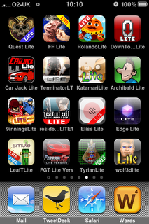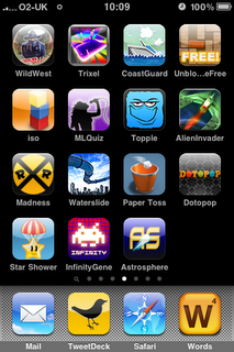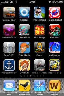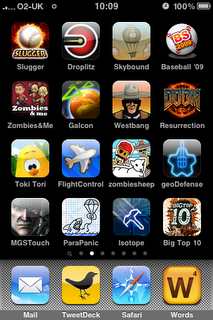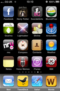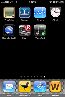 In this post my online chum deKay asked to see other people’s iPhone Home screens, so here are mine. It feels rather like inviting someone round to my house when I’ve not tidied up, but here we go.